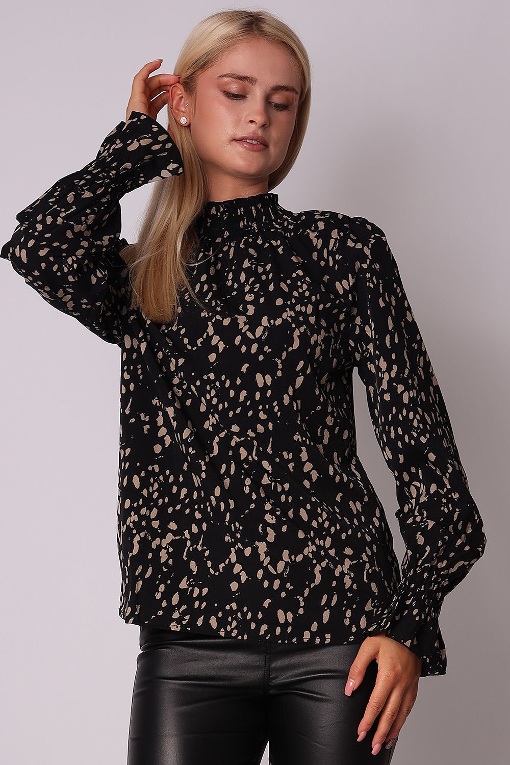 This blouse with a built-in neckline in black is a must-have in your closet for the new season. It has long sleeves with an elastic cuff, a high stand-up collar with a ruffle and a multicolor print. Pair with jeans and flat sole shoes for a casual daytime look, or pair with stilettos for the perfect evening outfit!