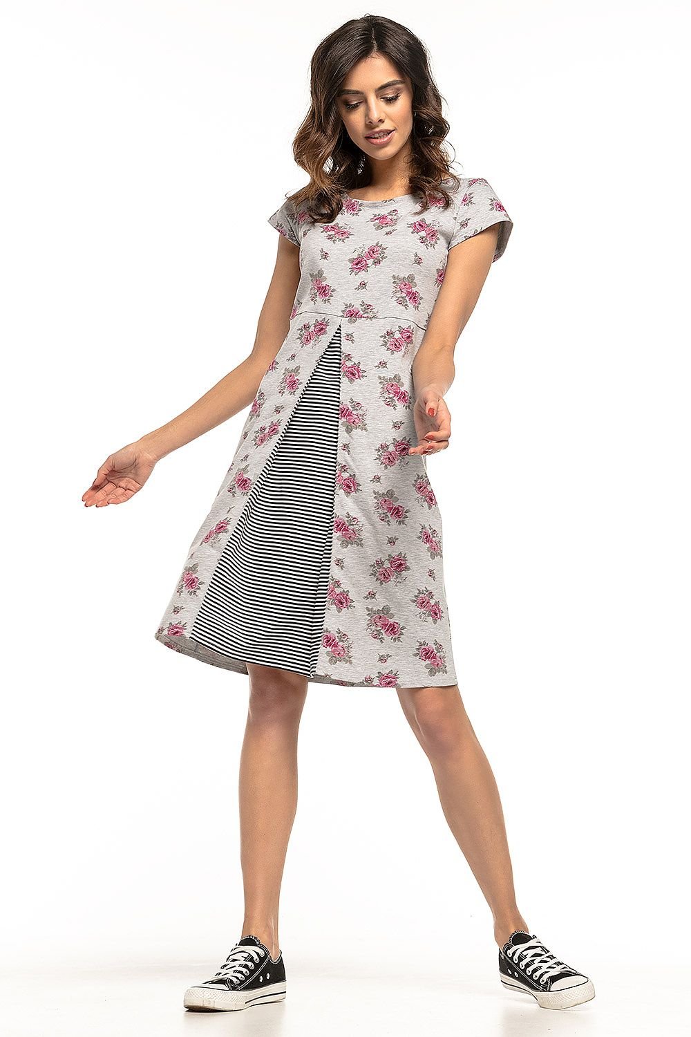 Slightly trapezoidal dress made of cotton knit with a front contour fold. To break up the floral pattern, we added a delicate white and black striped pattern on the counterfold, which definitely draws attention. The dress is not only suitable for a walk, but be sure to take it with you on your holiday trip.