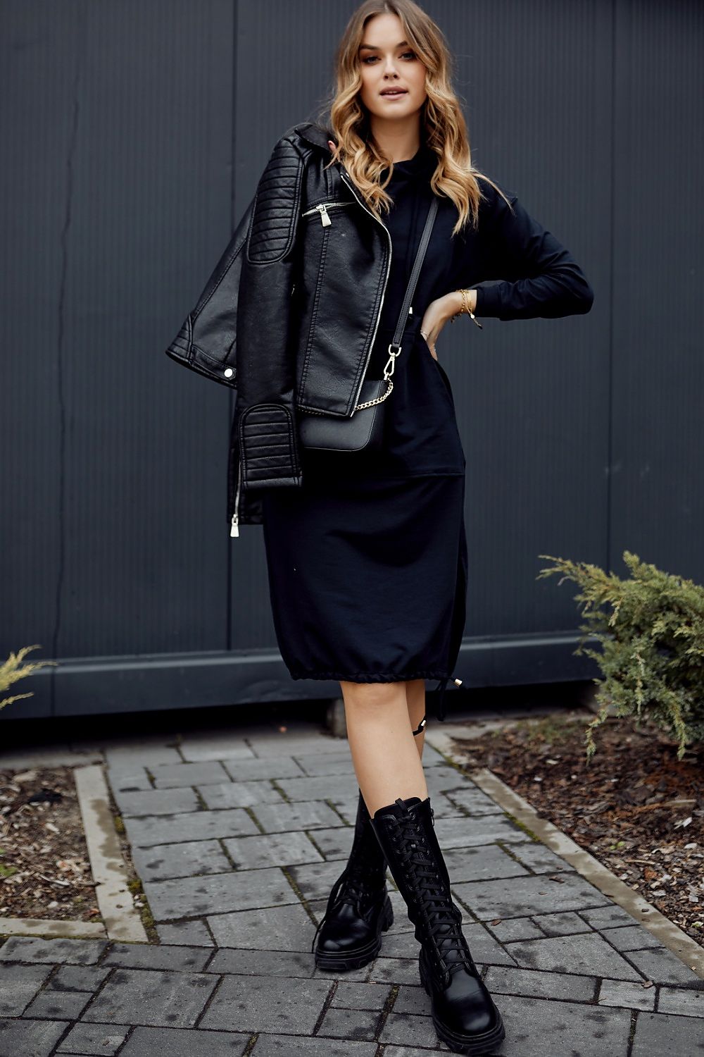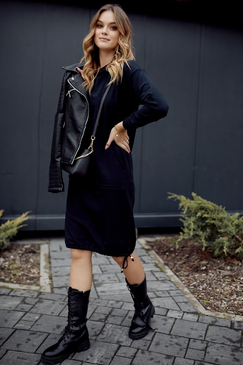 Do you like casual, comfortable and sporty looks? A navy blue hooded dress is a more comfortable alternative for many everyday looks. The dress has long sleeves and a kangaroo pocket. The bottom of the dress with a zipper and binding.
