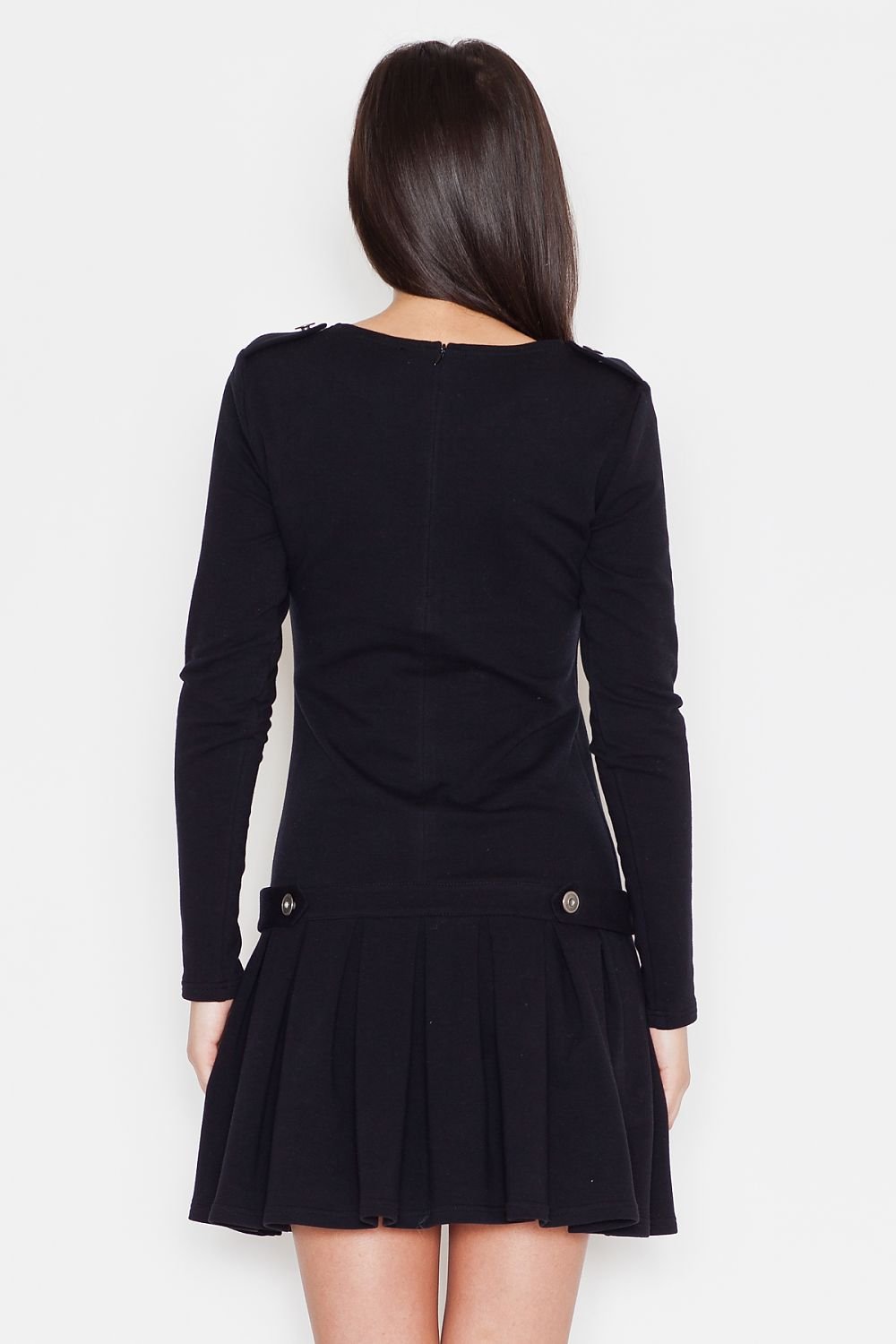 Long-sleeved cotton dress with epaulettes on the shoulders and hips, decorative buttons, no pockets, concealed zip at the back.