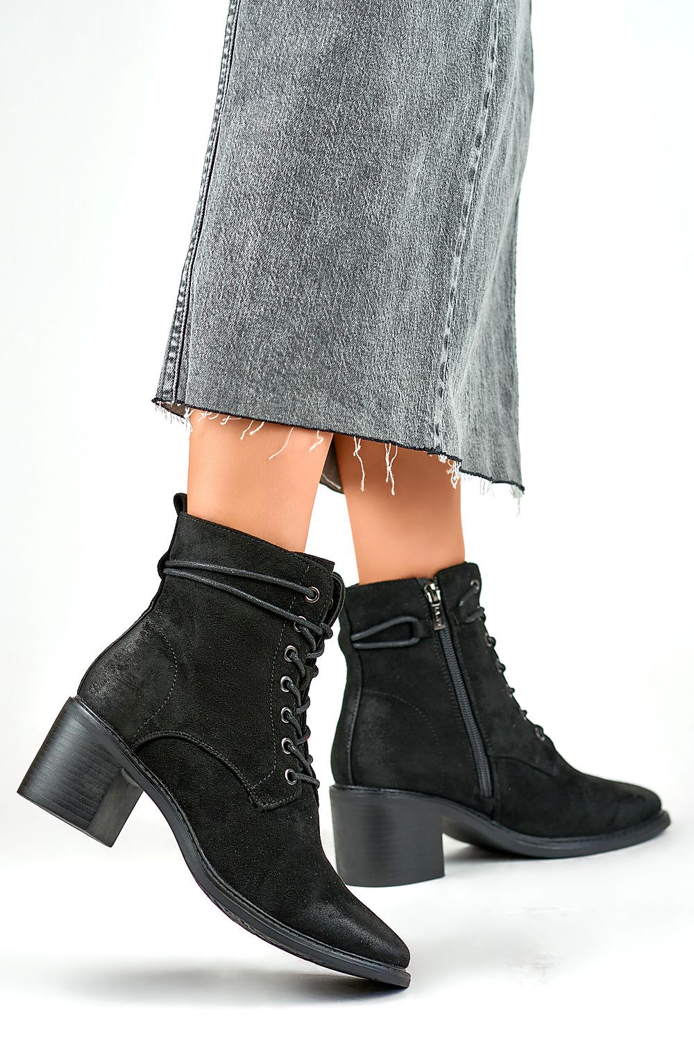 Sanlow boots on a post with a standard height. Square toe. Laced around the upper at the ankle. Made of eco-suede leather, they have a high upper with a zipper on the side and lace-up binding in front. Square shaped toe, slightly insulated with shoe blanket. Casual heeled boots are a great choice for everyday styling in the autumn season.