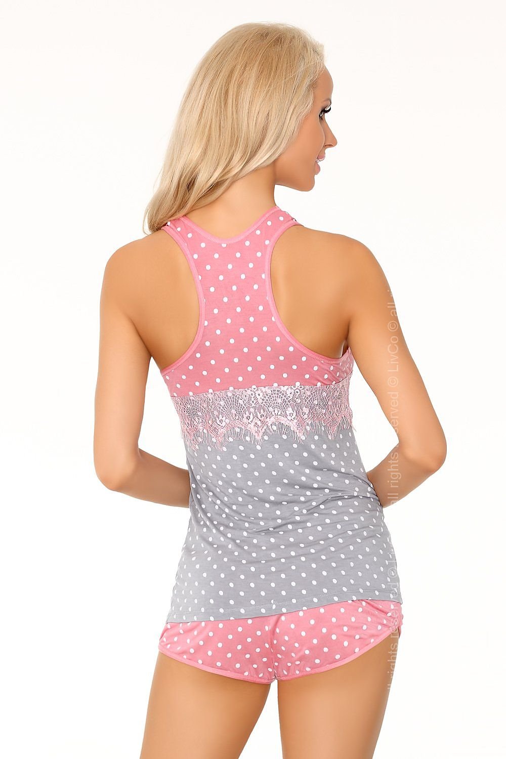 Two-piece dotted pyjamas from the latest Livco collection. Coral-grey, delicate, very comfortable. It will be also useful as a homewear. A boxer blouse with lace decoration at the top and sexy shorts on elastic band finished with small satin bow. Sweet & sexy!