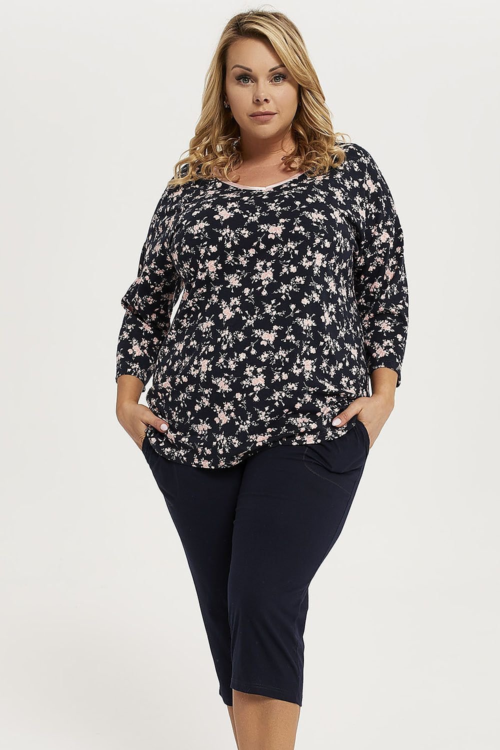 Women's pajamas with a loose cut consisting of a blouse and pants. Blouse with 3/4 sleeves ora round neckline. 3/4 length pants with slip pockets on the sides.