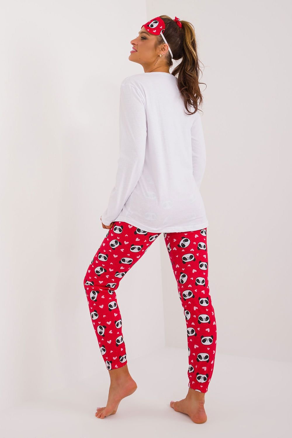 Introducing an elegant set of women's pajamas, which consists of a blouse, pants, blindfold and hair elastic. The pants are decorated with a colorful print, which gives them a unique character, and the blindfold and hair elastic are also decorated with the same motif, creating a cohesive and stylish set. The blouse has a colorful print on the front, which adds to the overall charm and originality. The pajamas are made of predominantly cotton material with a blend of polyester. Such a mixture ensures maximum wearing comfort, breathability and durability of the material, as well as ease of care. The long pants and blouse with long sleeves and round neckline are perfect for cooler nights, providing warmth and comfort. Choose our complete pajama set to enjoy a restful night's sleep and comfort, and add a touch of style to your nighttime closet.