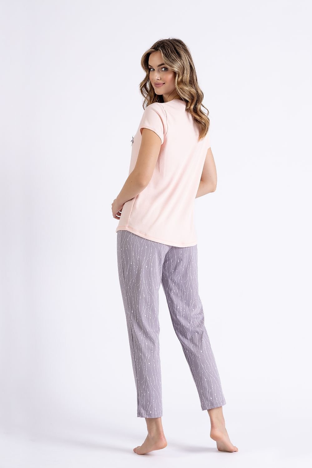 Women's pajamas created with comfort and style in mind. The short-sleeved blouse, adorned with a print, has a round and loose neckline, a comfortable cut that will be perfect for every night. Made of soft and breathable fabric, it provides comfort during sleep. 7/8 length pants, with a print and regular cut, are equipped with drawstrings at the waist, which allow for a perfect fit to the silhouette. The whole combines functionality and subtle style, perfect for every night.