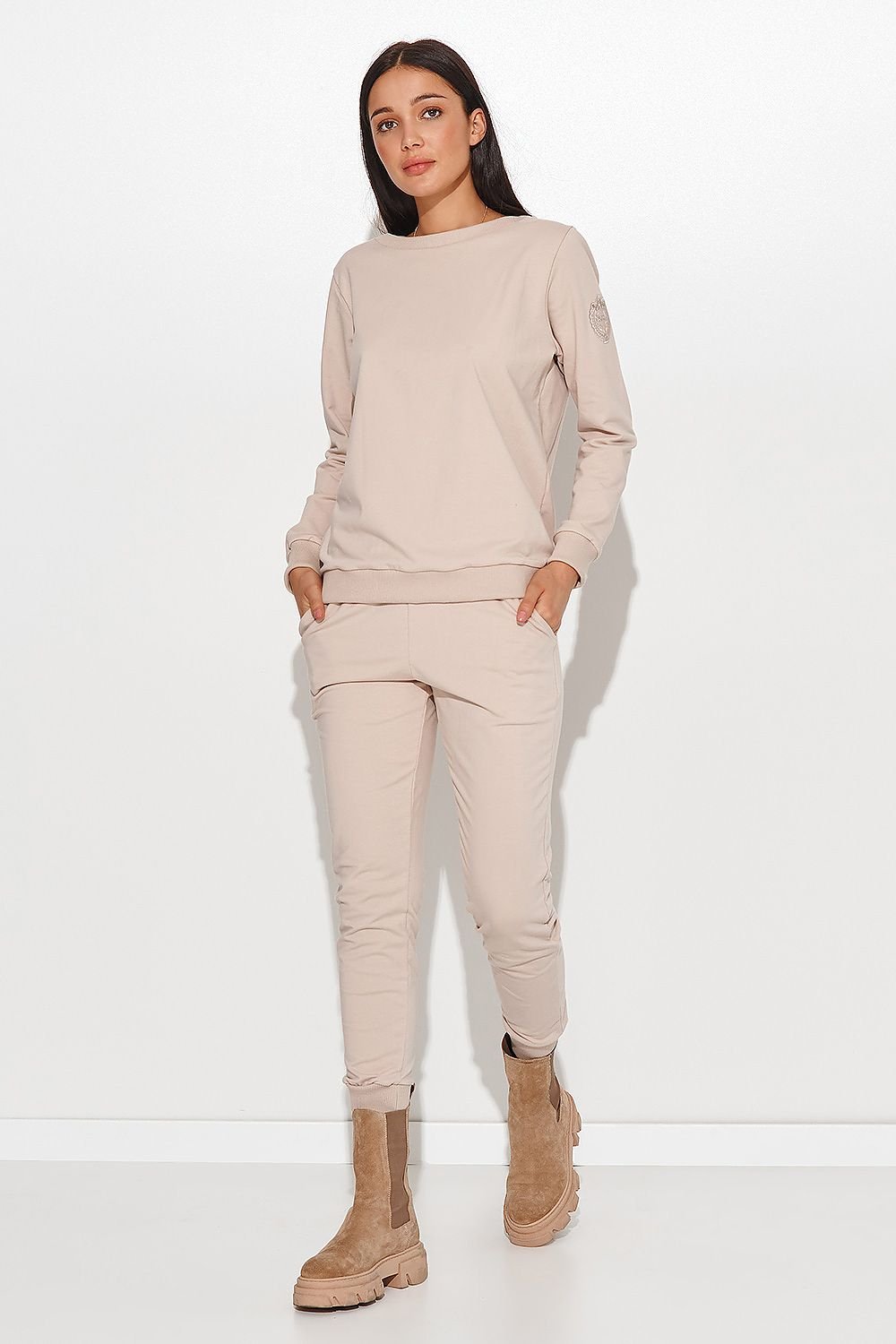 Classic women's set, made of thin cotton knitwear, will be perfect for business and everyday stylizations. The set is uniform and simple. The only decoration is a beautiful, delicate patch with the brand's signature. This makes the set extremely universal. The blouse has a round neckline and the pants have practical side slip pockets. Match it with your favorite high-heeled shoes and an elegant handbag, and go out on the town. Do you prefer casualness to elegance? Then slip on your sports shoes, grab your backpack and wear this beautiful tracksuit set.