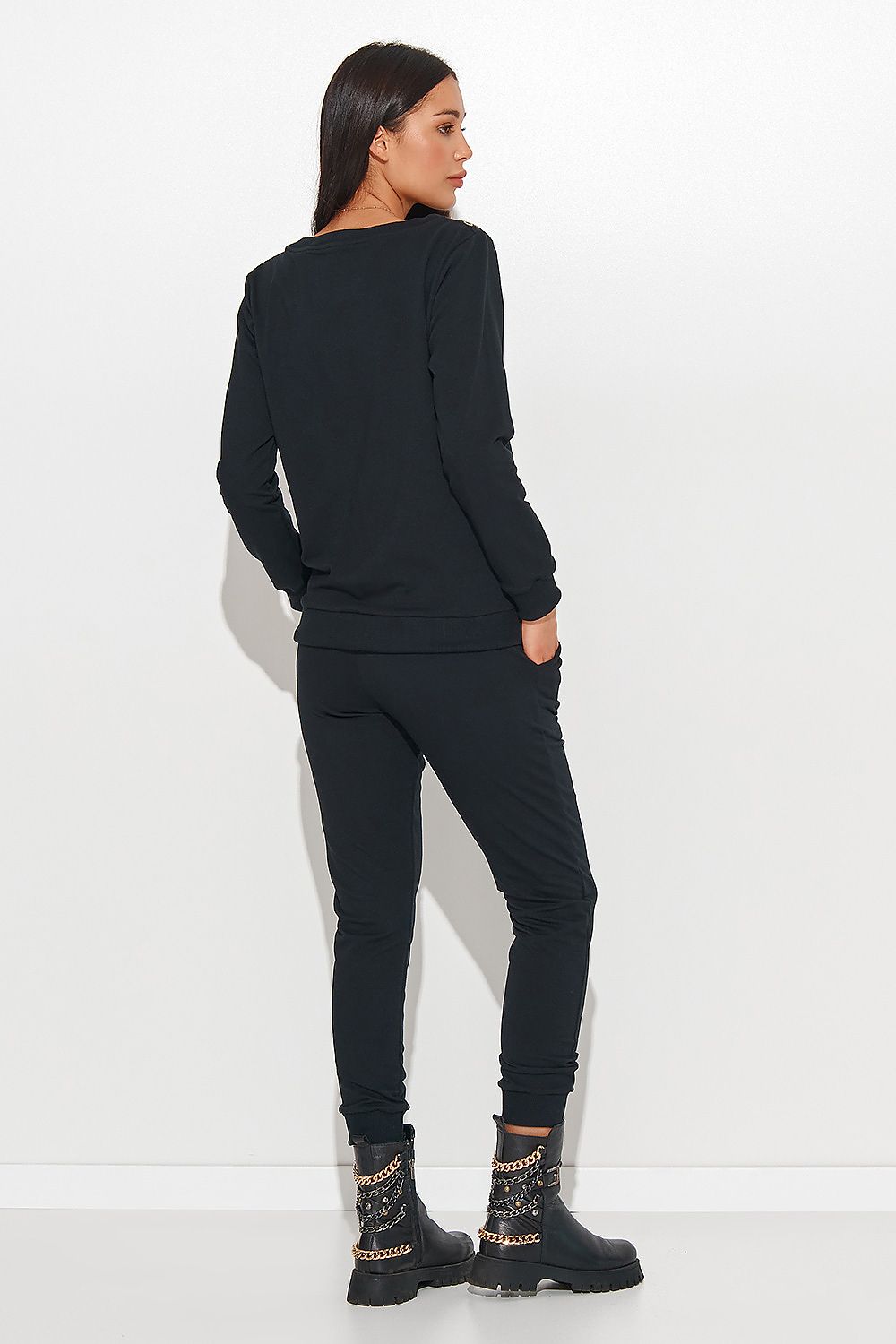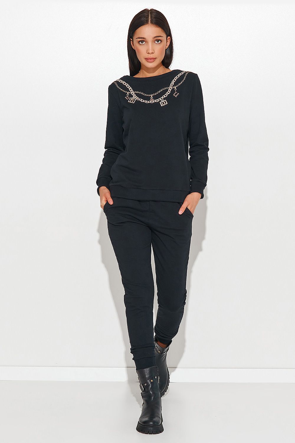 Women's sweatshirt set includes classic trousers and a sweatshirt worn over the head. The sweatshirt has a round neckline finished with a thin welt. This element is also found in the distal part of sleeves and around the waist. The sweatshirt has a beautiful embroidery imitating a chain on the front. There are also glittering crystals on the glittering thread. The trousers are straight, with side pockets and welts at the waist and at the end of both legs. The set comes in the following colors: cream, cappuccino, light beige and black. Perfect for everyday use, as well as for work. Can be worn with elegant stilettos or sports shoes.