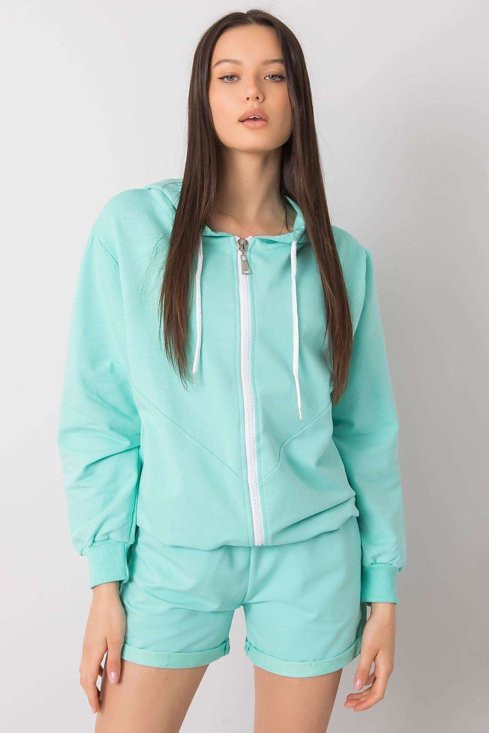 Tracksuit set consisting of a sweatshirt and shorts. Sweatshirt with zipper and hood. Shorts with elastic band and tie at waist, side pockets.