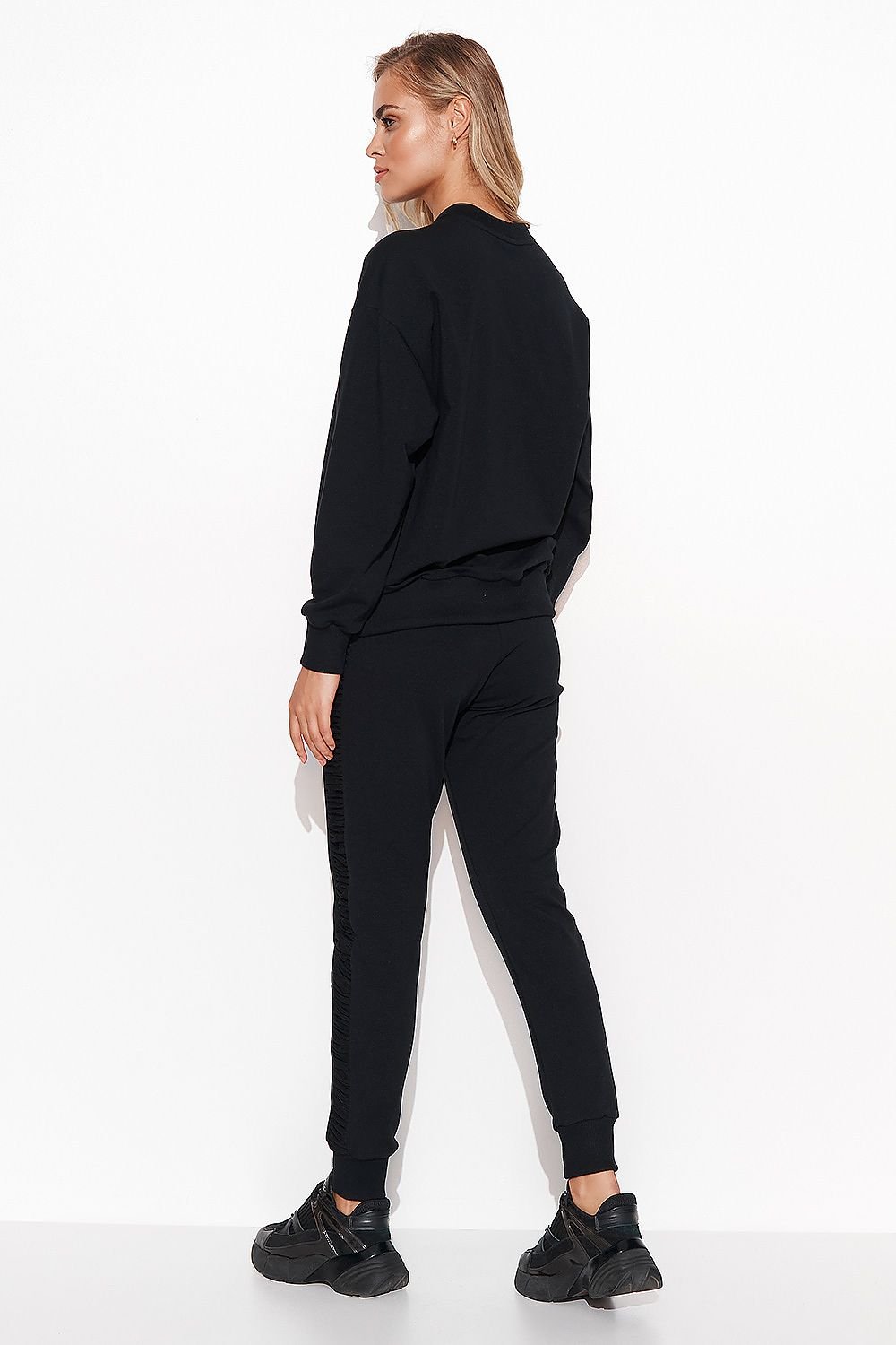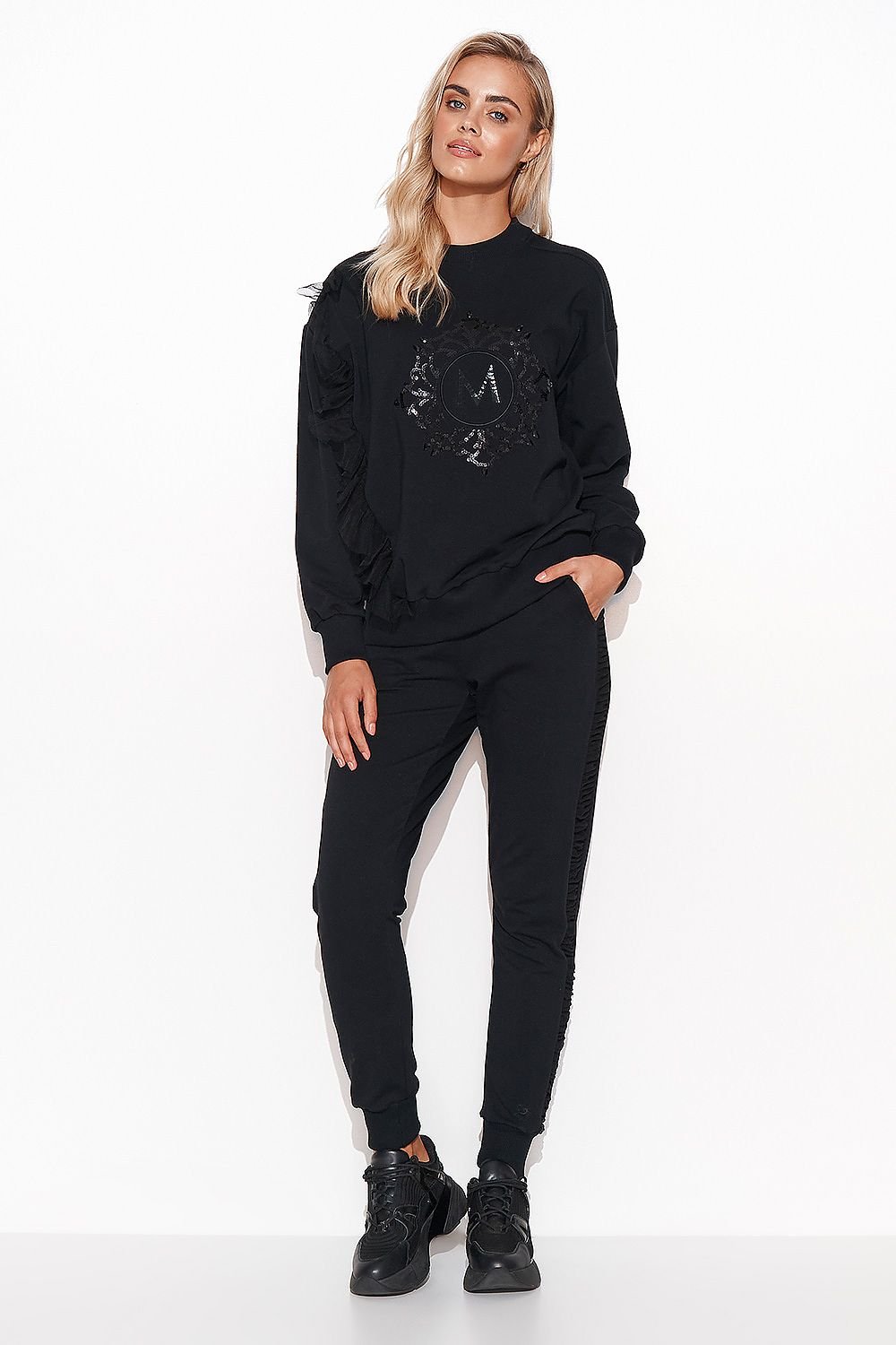 Elegant women's tracksuit set. It consists of a blouse tucked in over the head and classic slim-leg pants. The sweatshirt has decorative elements in the form of tulle ruffles, pulled through the entire length, and a patch with sequins. The patch is sewn in the central part of the blouse. The pants have side slip pockets. The set features welts in strategic places: at the ends of the sleeves and legs. This set provides great freedom of movement. You can style it in different ways, matching it with elegant stilettos, sports shoes or warm boots.