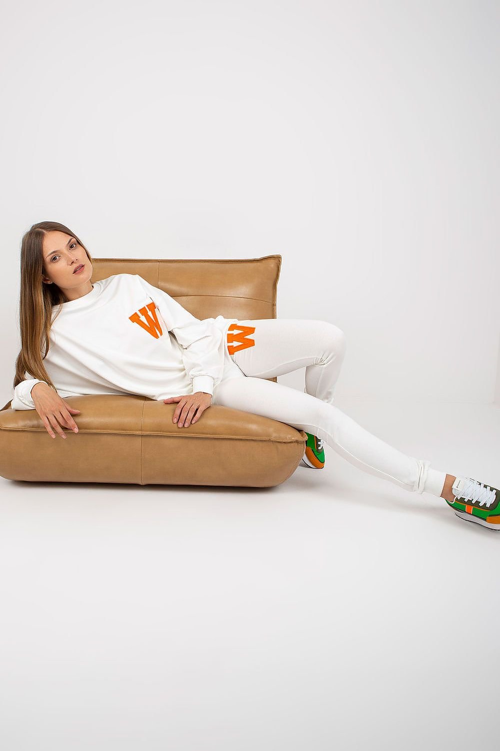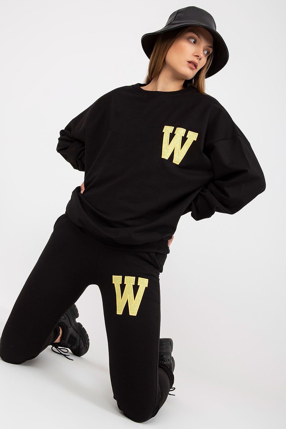 A sweatshirt set consisting of a sweatshirt and long pants. Sweatshirt of loose cut, with long sleeves. On the front a decorative patch. Long pants with elastic waistband and slip pockets.