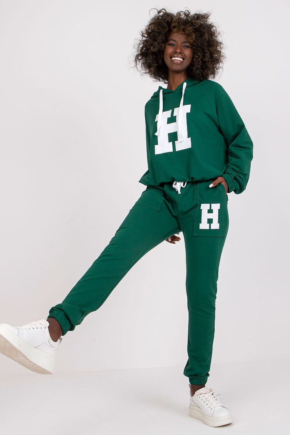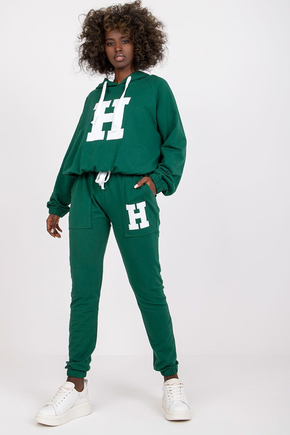 A sweatshirt set consisting of a sweatshirt and pants. Sweatshirt with long sleeves and a hood. Long pants with waist tie and slip pockets.