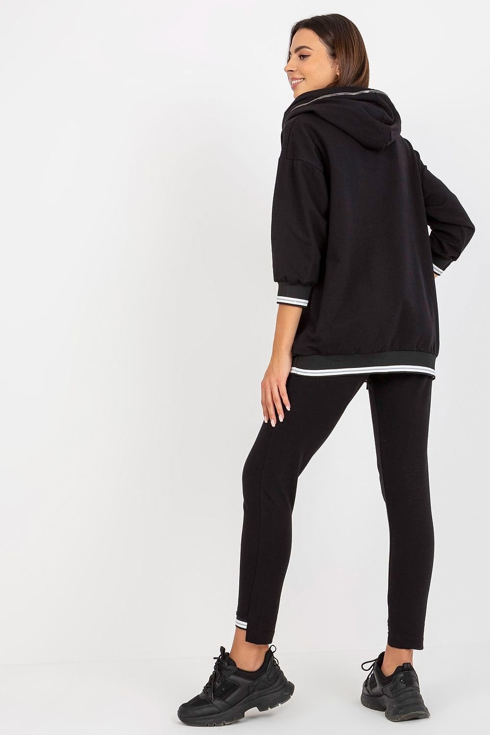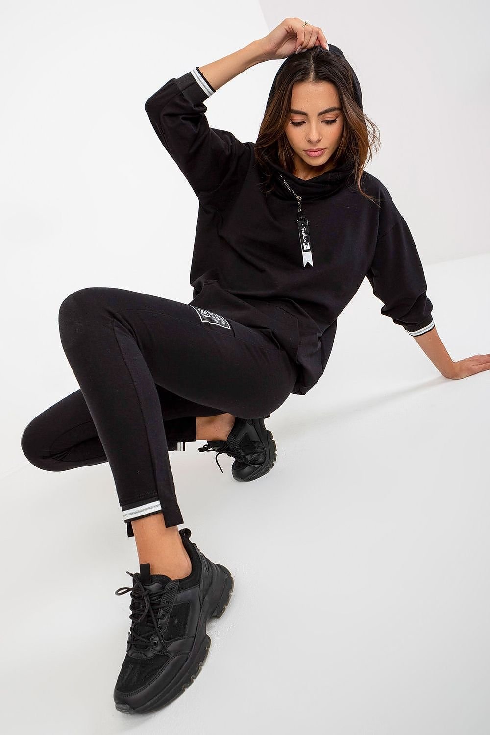 A set consisting of a sweatshirt and pants. Sweatshirt with long sleeves, hood and kangaroo pocket. Long pants with waist tie and slip pockets.
