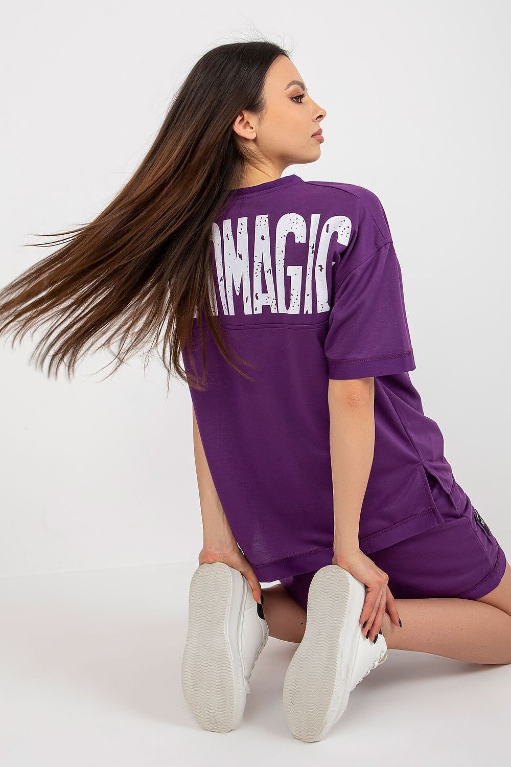 Cotton women's set consisting of a blouse and shorts. Blouse of a looser cut with short sleeves and a round neckline. Shorts with binding at the waist and slip pockets. Set with decorative patches.