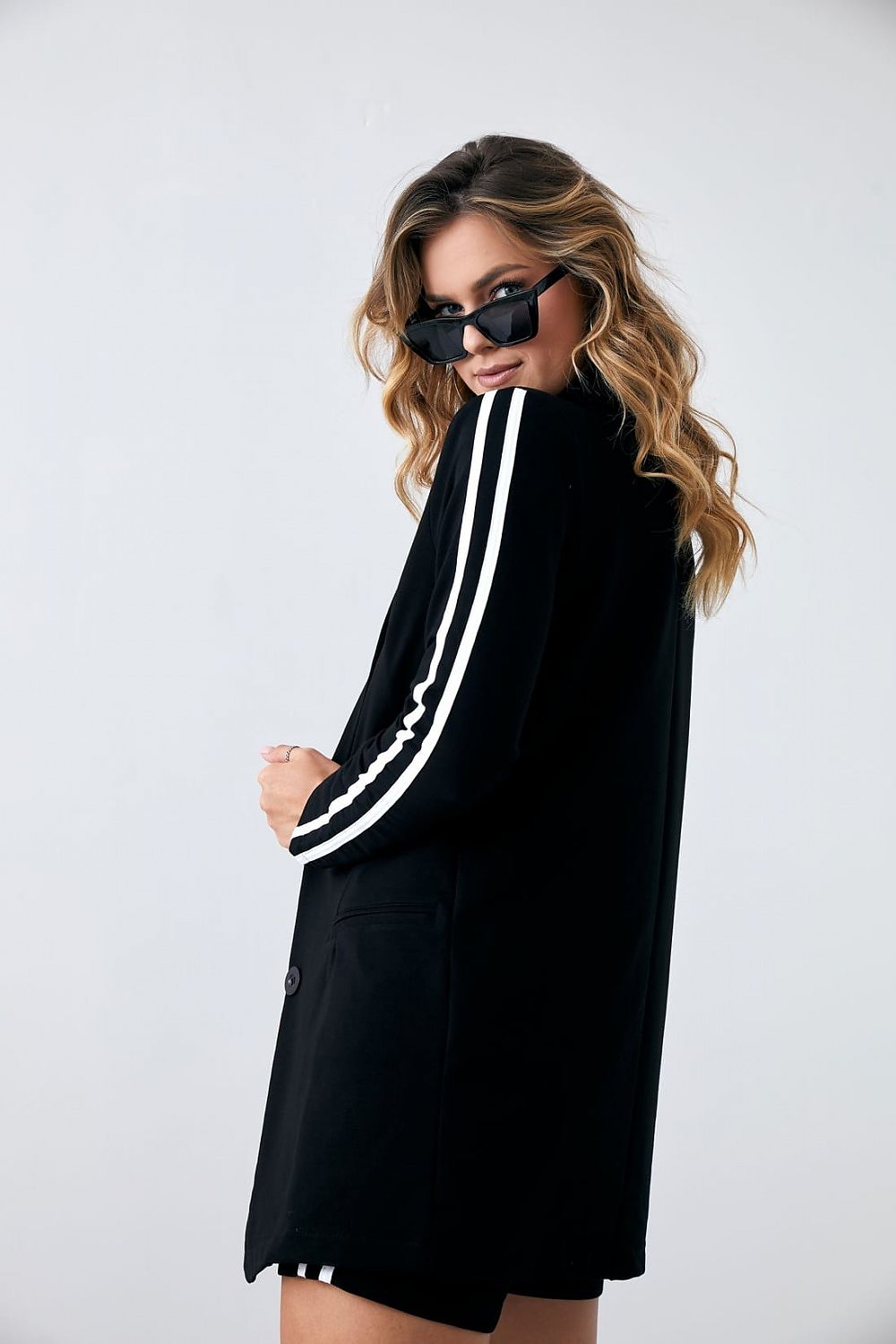 Looking for an original styling? Opt for a blue cotton set with decorative stripes. Simple jacket is lined, with long sleeves buttoned. On the shoulders sewn pillows. Short shorts zipped and buttoned, with elastic at the back. The set is decorated with contrasting stripes.