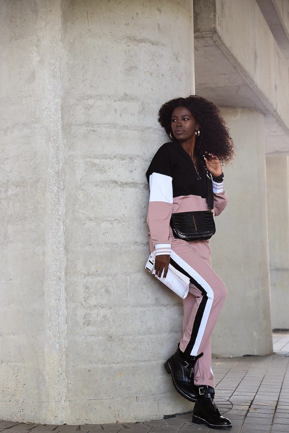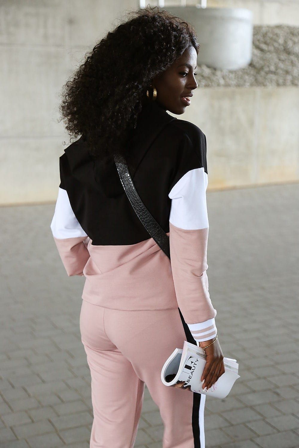 Tri-color women's tracksuit with a delicate mustard print on the front. Hooded sweatshirt fastened in the front with a short zipper. With long sleeves. Pants with elastic waistband and string binding. Long legs with side stripes and slip pockets. All finished with a drawstring waistband with two stripes. Made of smooth, monochromatic cotton fabric. Perfect for everyday wear, the gym or running.