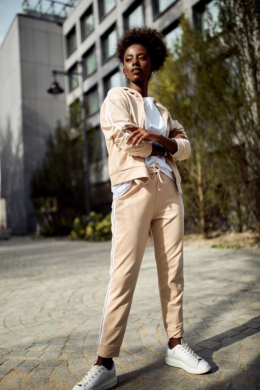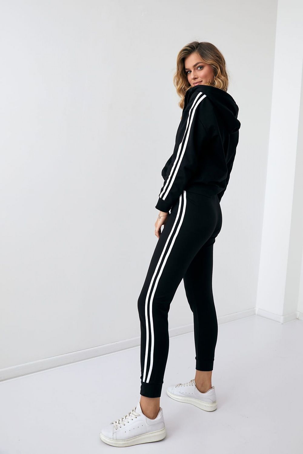 Navy blue tracksuit set with stripes is a must-have in every closet. Versatile and timeless, the set will work for sporty and everyday styling. Zippered sweatshirt with long sleeves and hood. Long pants with elastic waistband and binding. Set with contrasting stripes.