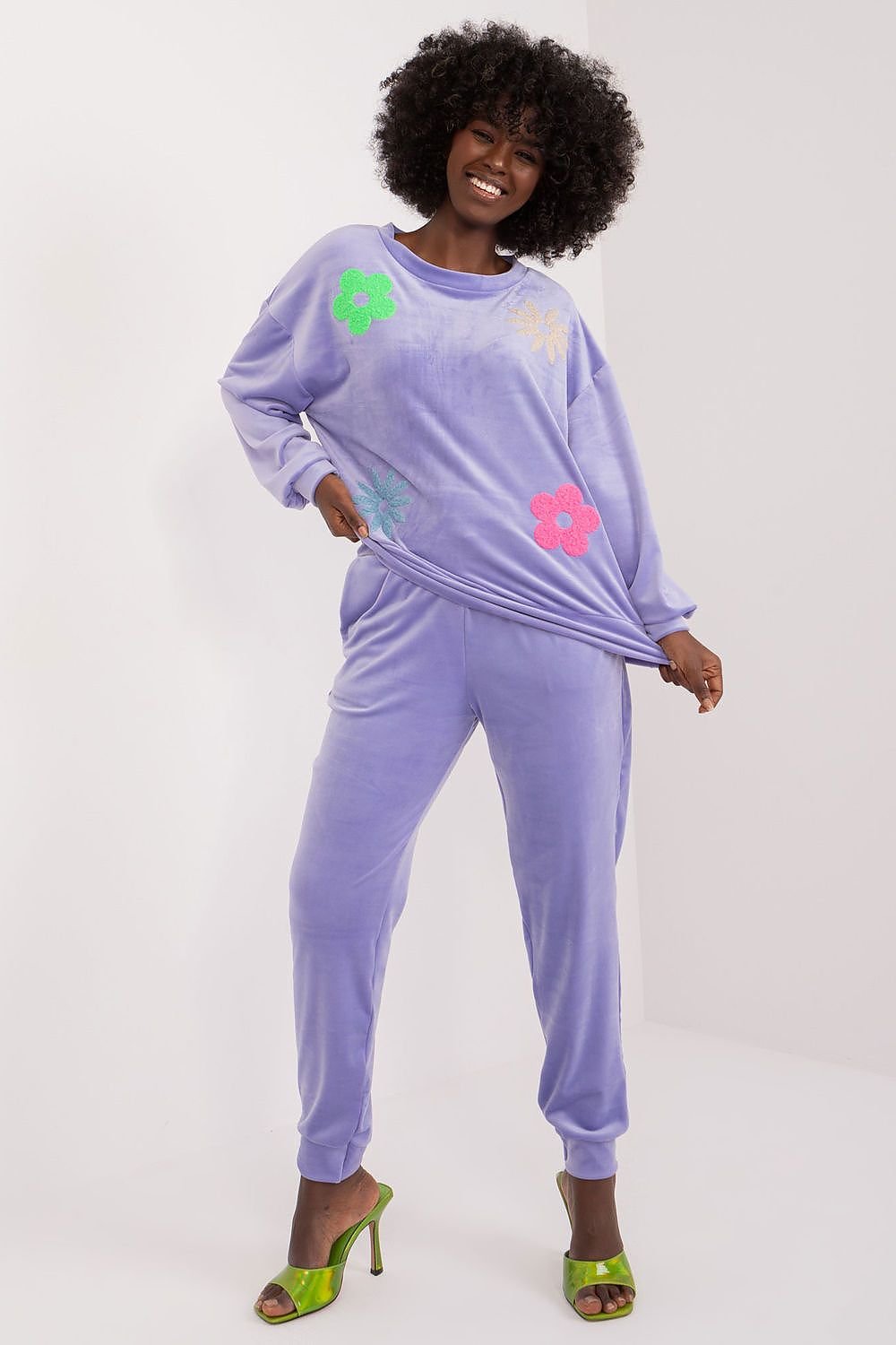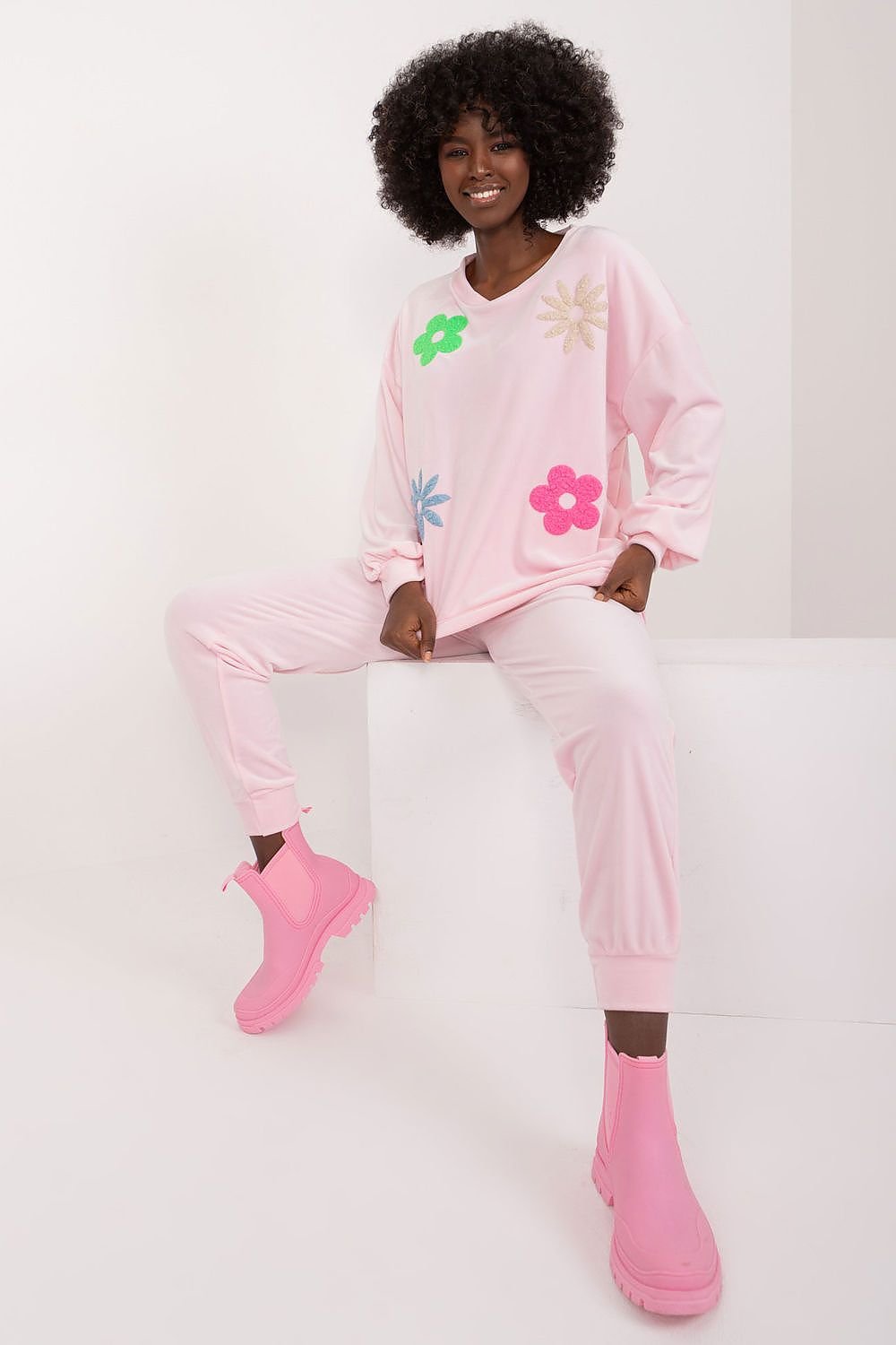 The velour set, consisting of a sweatshirt and pants, is a combination of elegance and comfort, perfect for casual moments of relaxation. Created with wearing comfort and a fashionable look in mind, this set is sure to attract attention with its unique design. The dominant material is soft polyester, which, combined with a velour finish, provides a pleasant feeling on the skin. The set is decorated with printed flowers on the front, which gives it a fresh and romantic feel, perfect for summer evenings. The standard length of the blouse and pants makes the set practical and versatile. Stylized welts on the legs of the pants add a modern, sporty look, while providing freedom of movement. The high rise of the pants accentuates the waist, and the side slip pockets in the pants are both practical and stylish. The long-sleeve blouse with a round neckline is comfortable and tailored for everyday wear. The whole creates a harmonious image, combining elegance and casualness. The velour set with printed flowers is an excellent choice for lovers of casual style with a touch of romance.