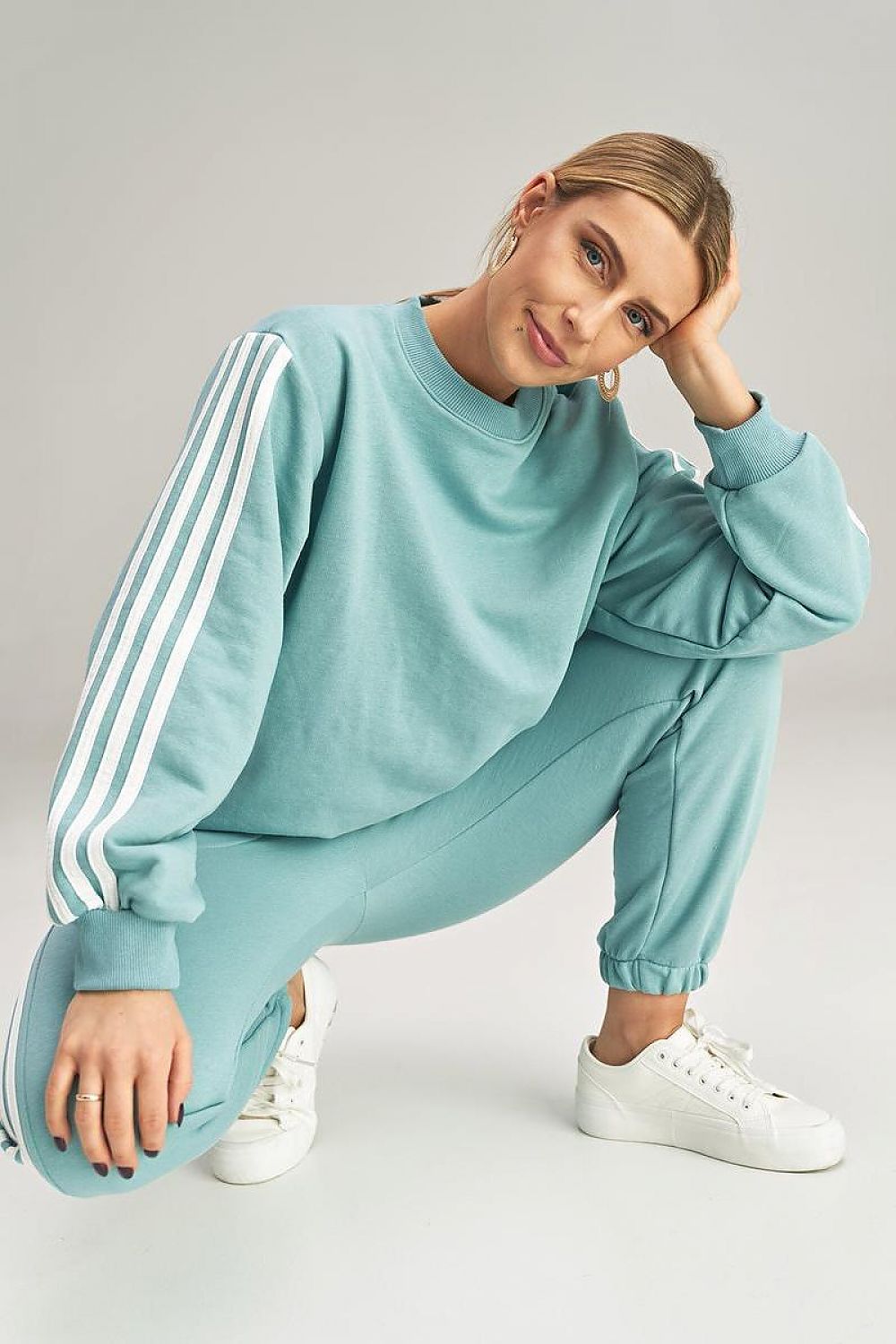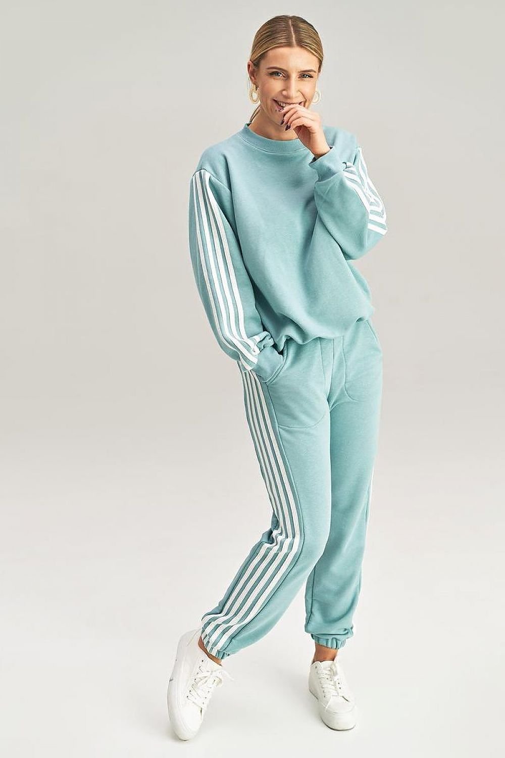A tracksuit set consisting of a loose, pullover sweatshirt without a hood and sweatpants. The sweatshirt has long sleeves and a round neckline. The long pants feature an elastic waistband and slip pockets. Both the sleeves and pant legs have contrasting stripes. One size fits individuals who wear size S or M.