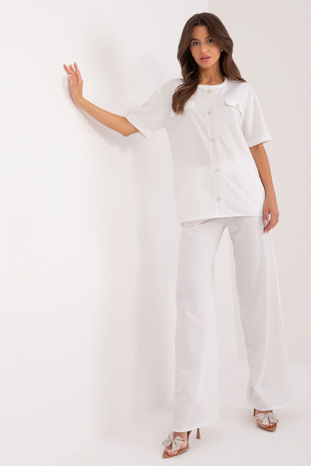 Introducing our new women's set, consisting of an elegant blouse and comfortable pants. This ensemble is the perfect combination of style and comfort, ideal for both casual outings and work. The blouse is made of high-quality, smooth fabric, giving it an elegant and versatile character. The short sleeves make the blouse perfect for warmer days, providing freedom of movement. The classic round neckline adds a subtle charm to the blouse and complements various stylings. The decorative buttons on the front of the blouse add elegance and serve as a stylish accent. The pants are equipped with a practical tie at the waist, allowing for a perfect fit and highlighting the waist. Made from the same smooth, solid fabric as the blouse, they create a cohesive and elegant set. The straight legs make the pants classic and versatile, seamlessly blending with different wardrobe items. The high waist provides comfort and a sophisticated look, accentuating the silhouette. The practical side slip pockets add functionality without compromising the pants' elegant appearance. This women's set, consisting of a blouse and pants, is an excellent choice for women who value comfort and style. The smooth, solid fabric and classic details make this set perfect for everyday outings and work. With carefully selected elements, such as the decorative buttons on the blouse and the tie at the waist of the pants, you will always look elegant and feel comfortable.