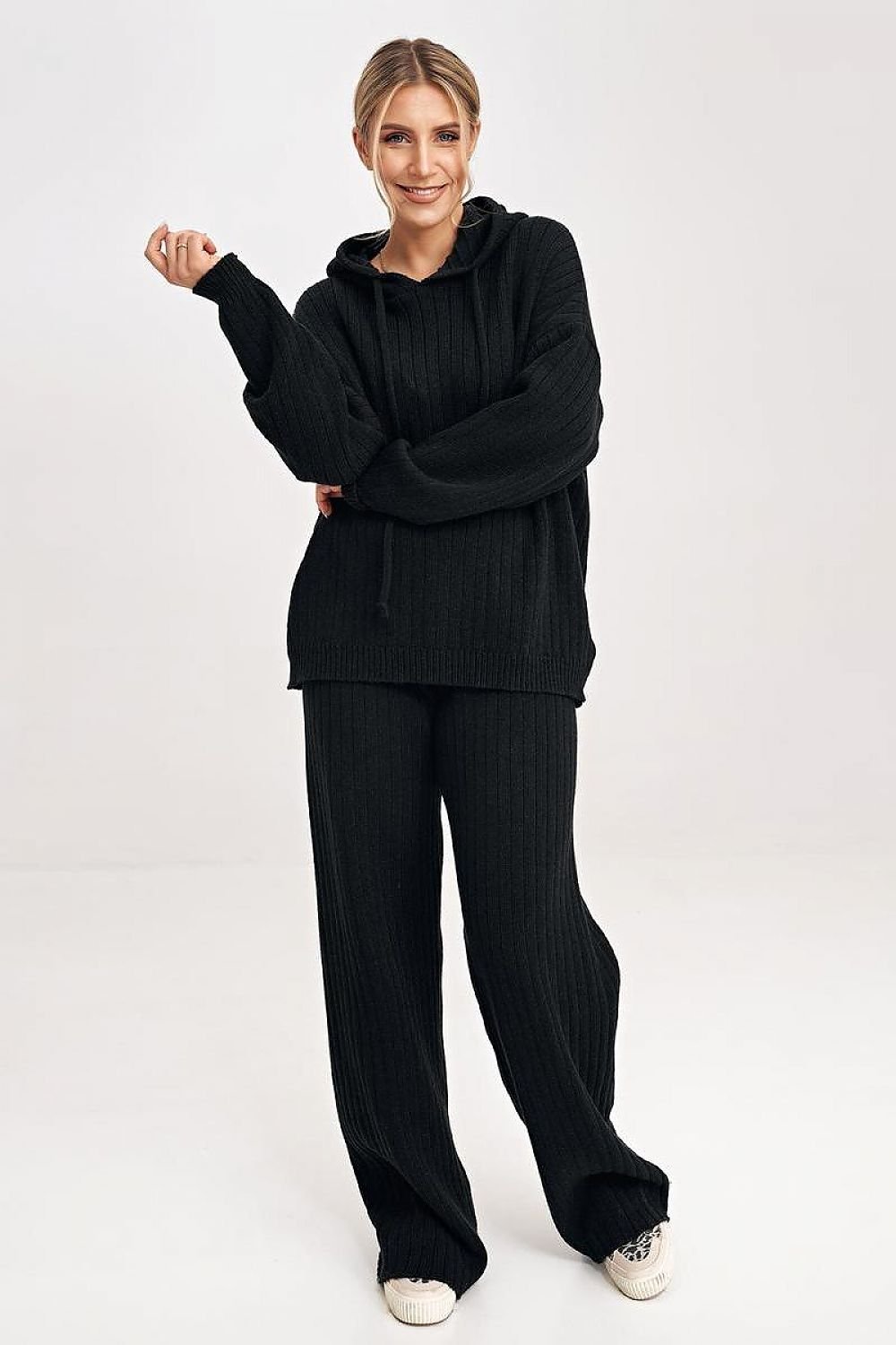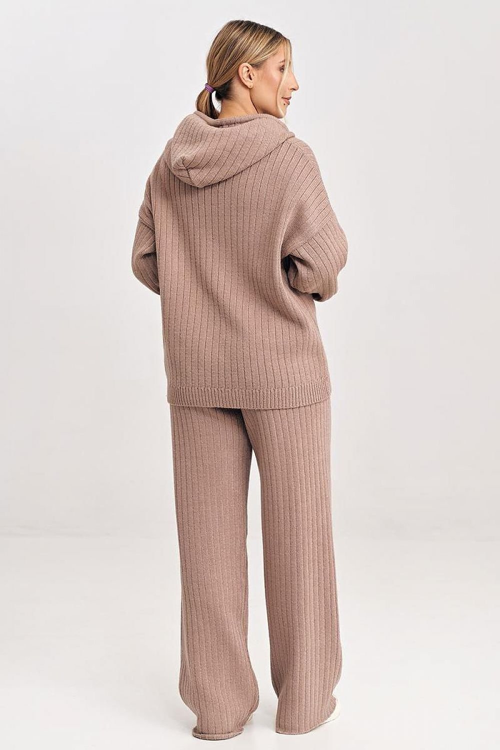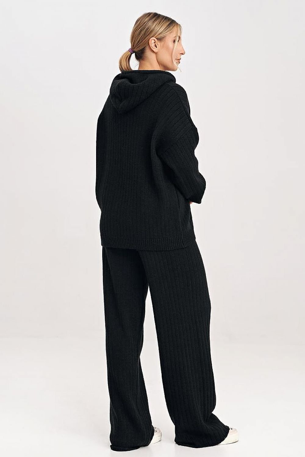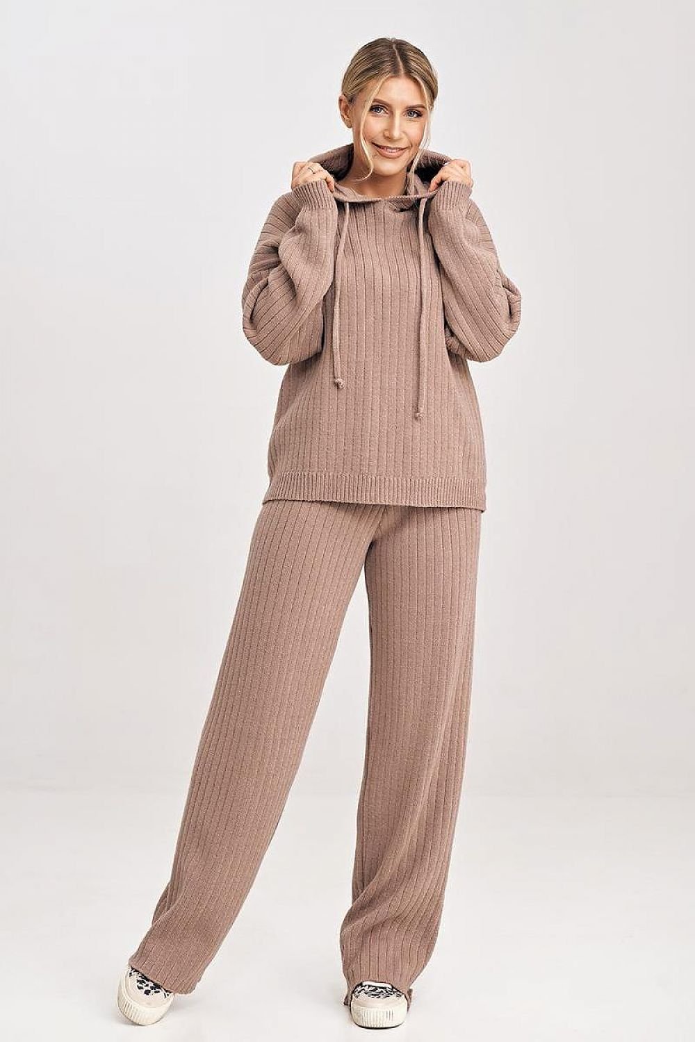 Knitted set consisting of a sweatshirt and pants. Sweatshirt with long sleeves and a hood. Long pants with wide legs, with an elastic band at the waist.