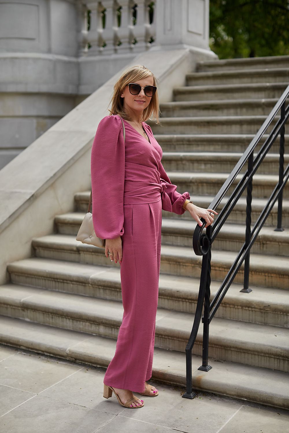 A two-piece formal set. It was entirely made of soft and natural fabric. The blouse is adjustable with a tie, which makes it perfectly fit the silhouette. Wide (but not too much) high-waisted pants complete the whole outfit. The front of the pants is smooth and elegant, while the back has a 5 cm elastic band sewn in, making the pants comfortable and fitting to the silhouette. Additionally, a hidden zipper is sewn on the side, making it easier to put on and take off. The whole set is very carefully made. The pants are easy to shorten.