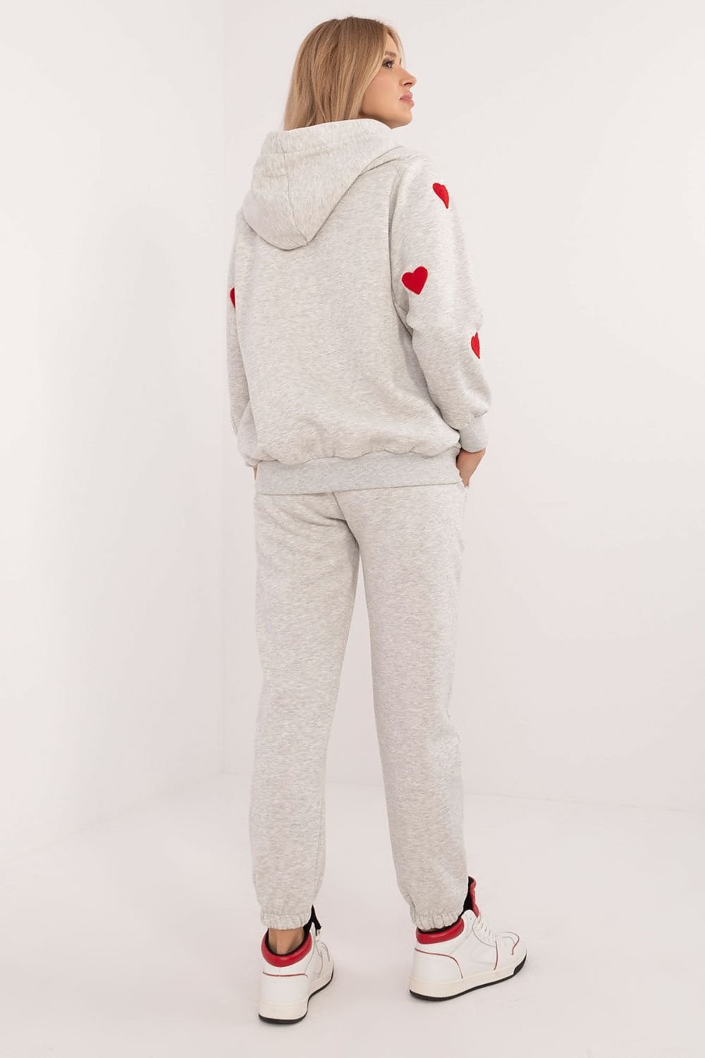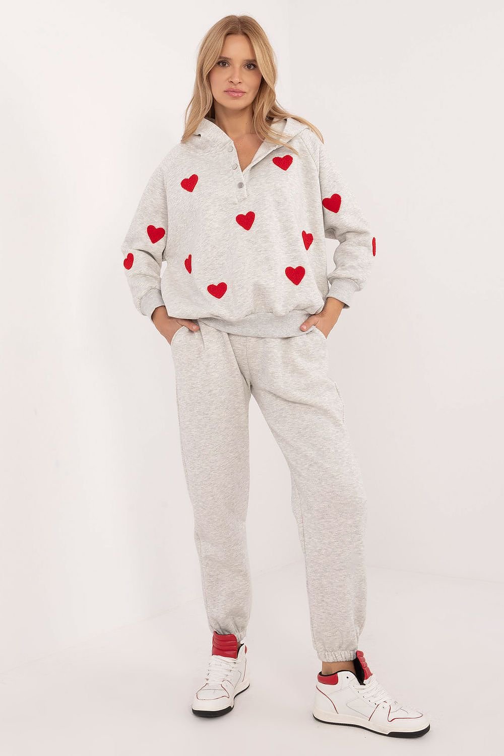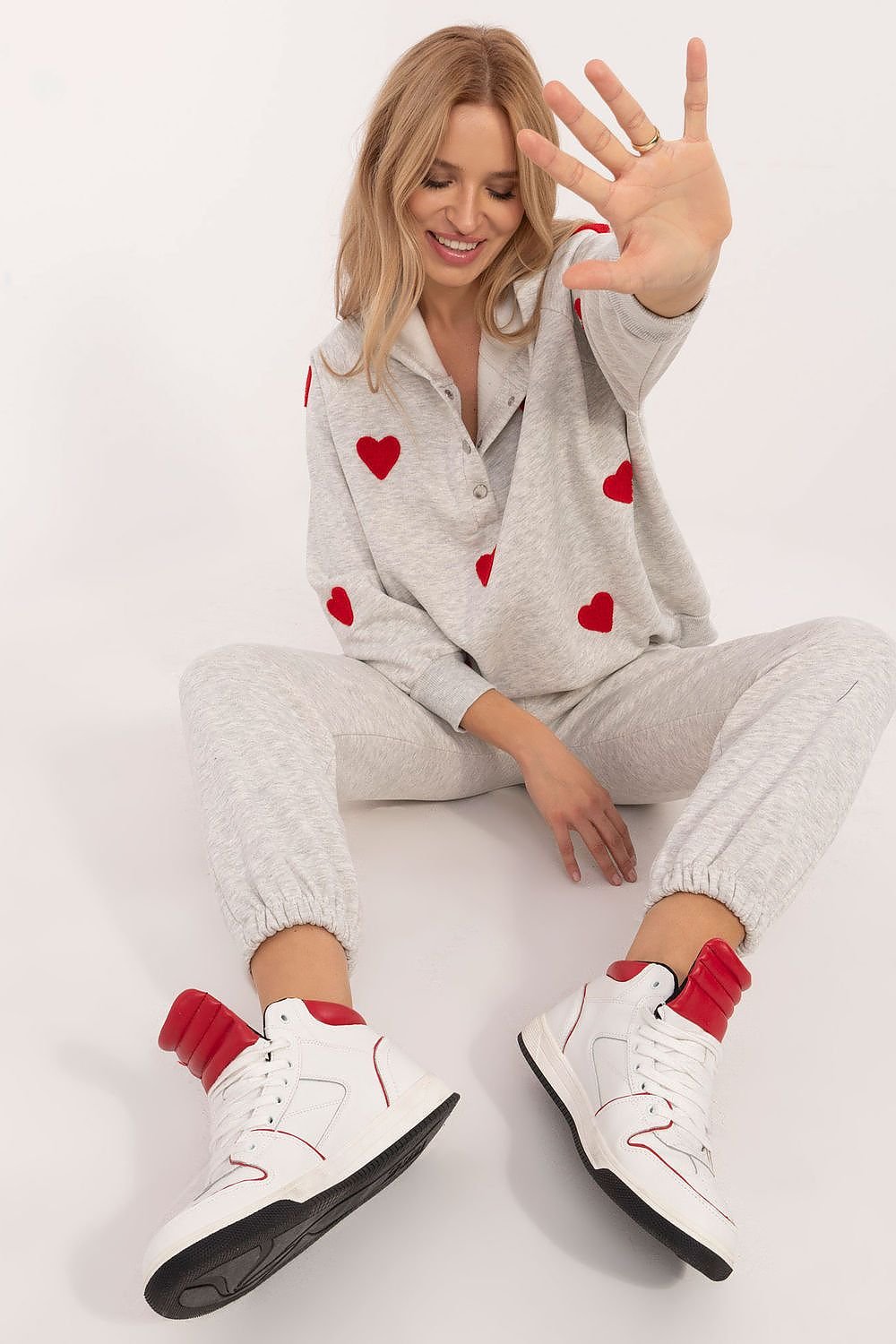 Warmed casual women's sweatshirt set, ideal for everyday outings, consists of a sweatshirt and pants. Made from a combination of cotton and elastane, the set provides excellent comfort, warmth and flexibility, ideal for colder days. The pants have long legs finished with ribbed cuffs, which guarantees a comfortable fit, while the high waist with binding at the waist accentuates the silhouette and provides additional adjustment. In addition, side slip pockets are a practical solution for small items. The long-sleeve sweatshirt is fastened with a half-zip fastener, which adds to its stylish character and comfortable wear. It also features a hood, perfect for chilly days, and adorable heart-shaped patches that give the sweatshirt a unique and fashionable touch. This insulated set is the perfect combination of comfort, style and functionality for everyday styling.