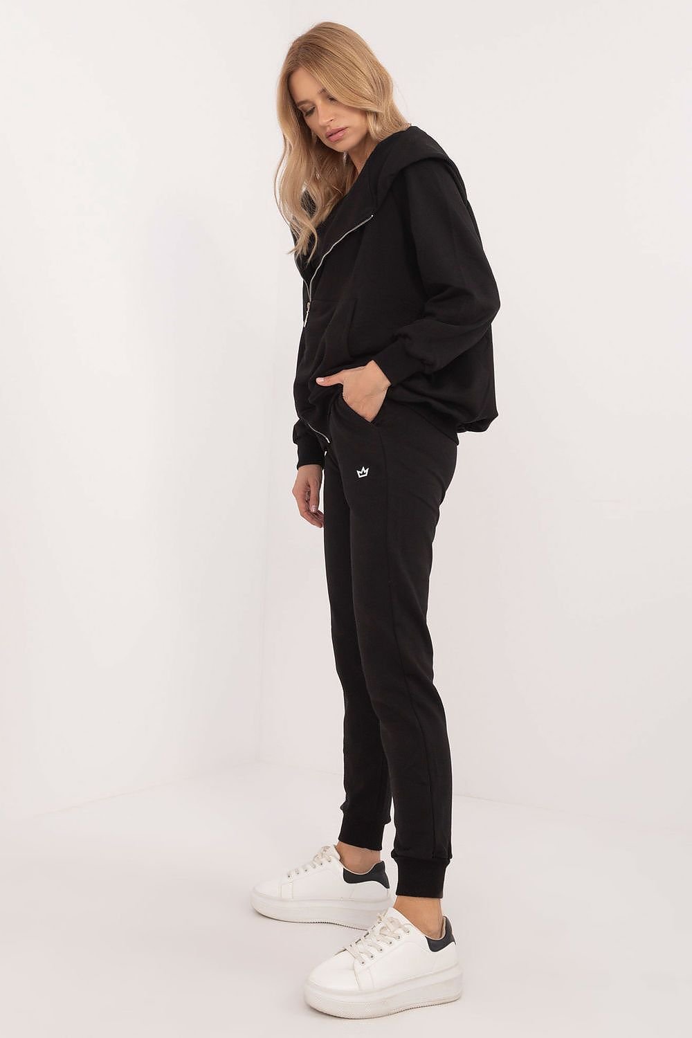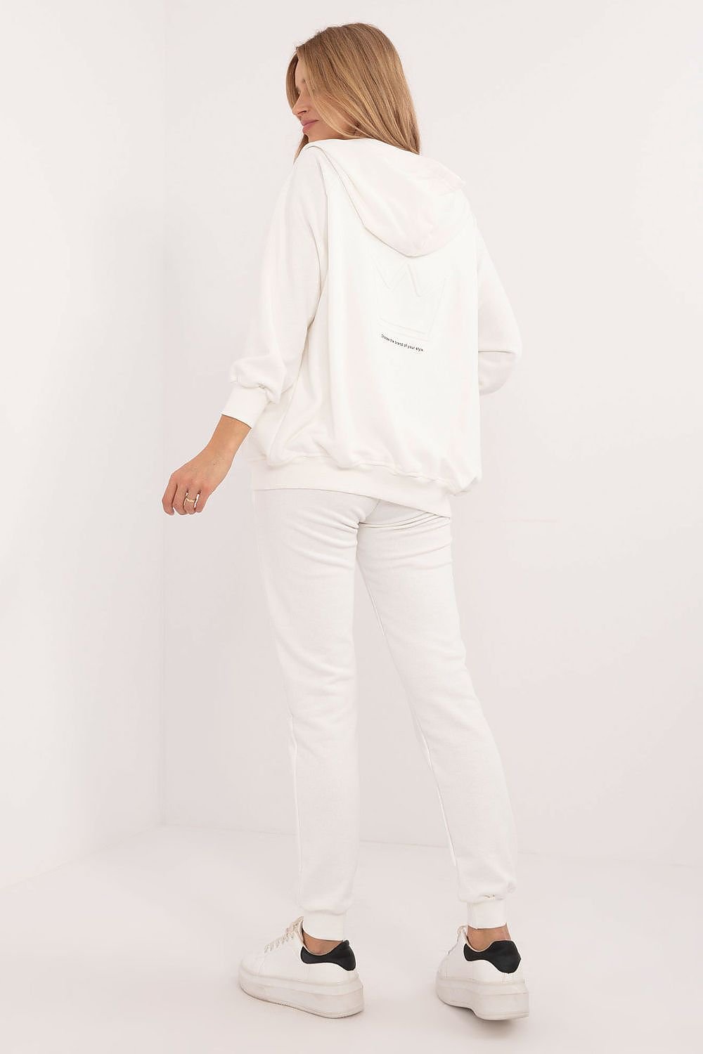 Women's casual style sweatshirt set, ideal for both casual outings and sports activities, consists of a T-shirt, sweatshirt and pants. The set has a plain pattern, which gives it a versatile character, and the dominant material is a soft and durable blend of cotton and polyester for comfort and breathability. The pants have long legs finished with ribbed cuffs and a high rise, which accentuates the silhouette and gives full freedom of movement. There is an elastic waistband for a perfect fit. In addition, the pants have side slip pockets, which are practical and functional. The long-sleeve, zippered sweatshirt features slip-in pockets and a hood for added sporty style and protection from the cold. The T-shirt with a classic round neckline is the perfect complement to the set. This set is a combination of comfort, functionality and style, perfect for every day and sporty activities.