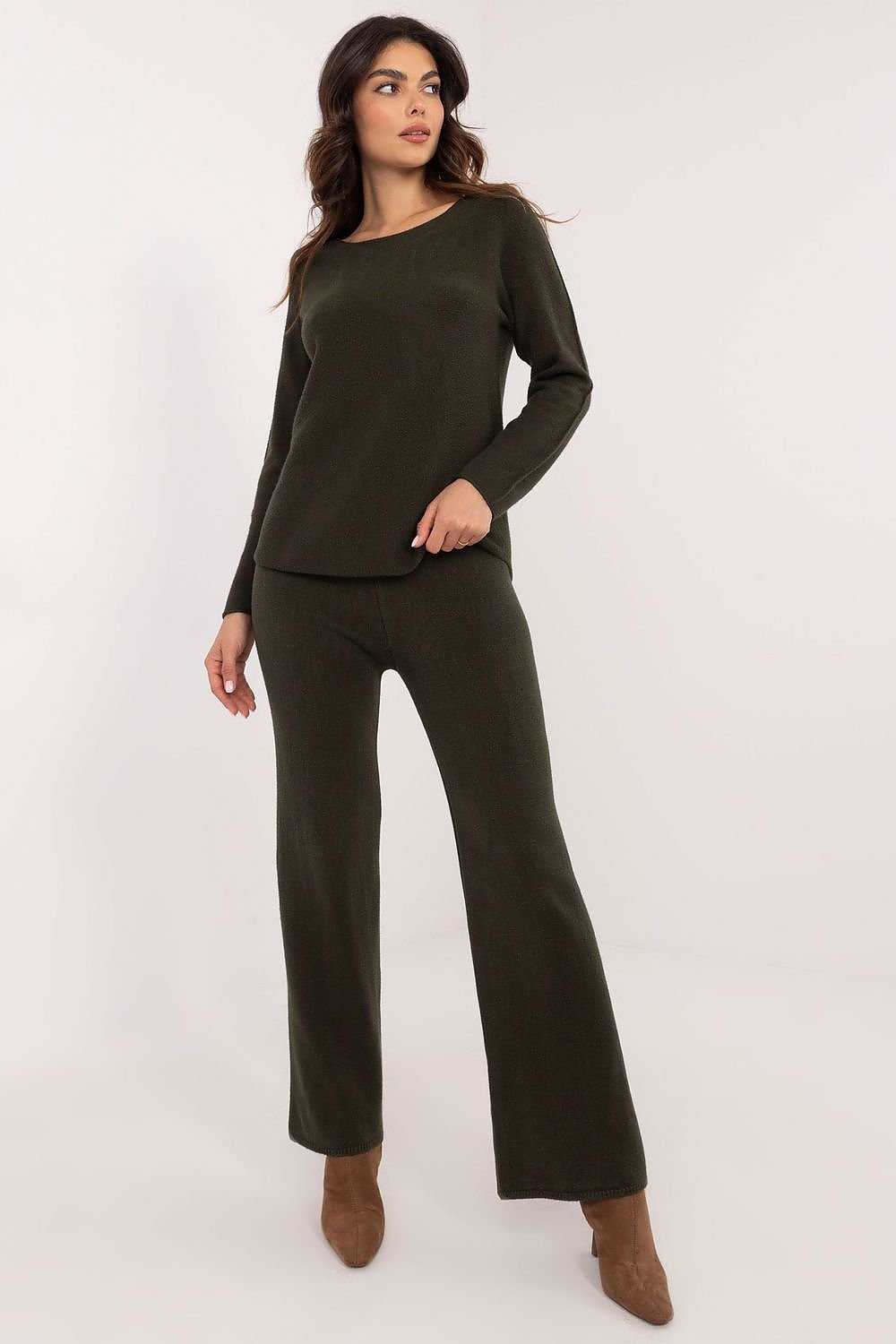 Casual sweater set, consisting of a comfortable sweater and pants, ideal for everyday styling. Made from a soft blend of viscose, polyester and nylon, it provides comfort and a pleasure to wear. The smooth texture of the material adds a modern, minimalist look to the set. The sweater has long sleeves and a round neckline for a classic, versatile fit. The wide-legged, high-waisted pants perfectly shape the figure, and the lack of pockets gives them a clean, elegant line. This is a stylish and comfortable everyday set, perfect for a walk, work or relaxing at home.