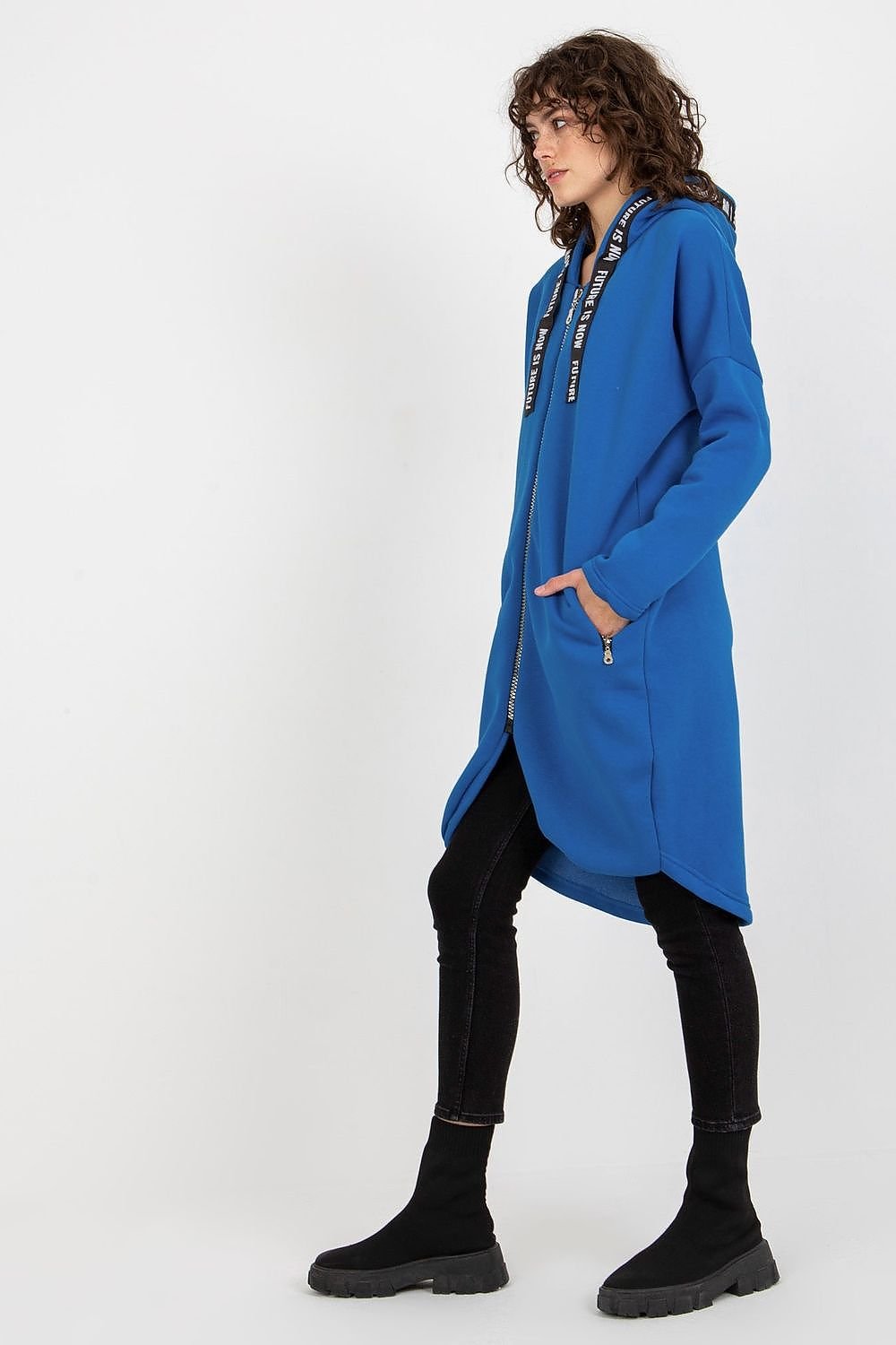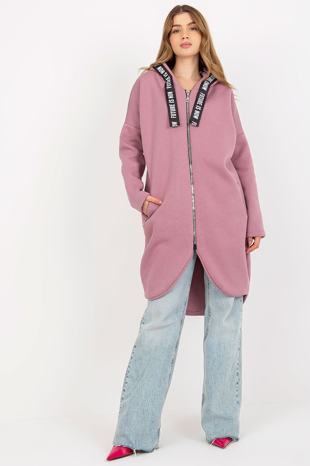 Women's sweatshirt with an extended cut, long sleeves and a hood. The sweatshirt is zippered, with slip pockets on the sides also zippered.