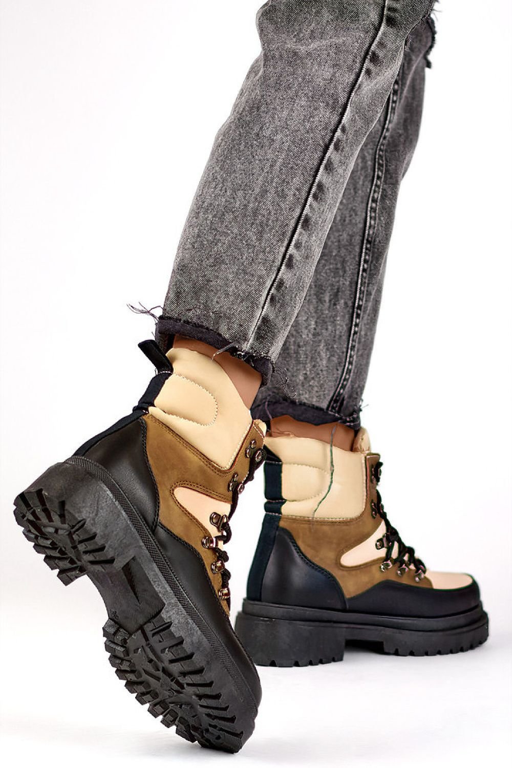 Women's black and green colored trappers for the autumn/winter season, made of durable synthetic material, will be perfect for changing cold conditions. The 16 cm high upper stably wraps around the ankle, providing support and protection. The interior lined with a textile insole with warming provides thermal comfort and comfortable wear. The 4 cm high heel adds subtle height and provides good insulation from the cold ground. The trappers lace up at the front for a precise fit to the foot, and the round toe gives them a classic, versatile look. Perfect for both urban and outdoor styling on colder days.