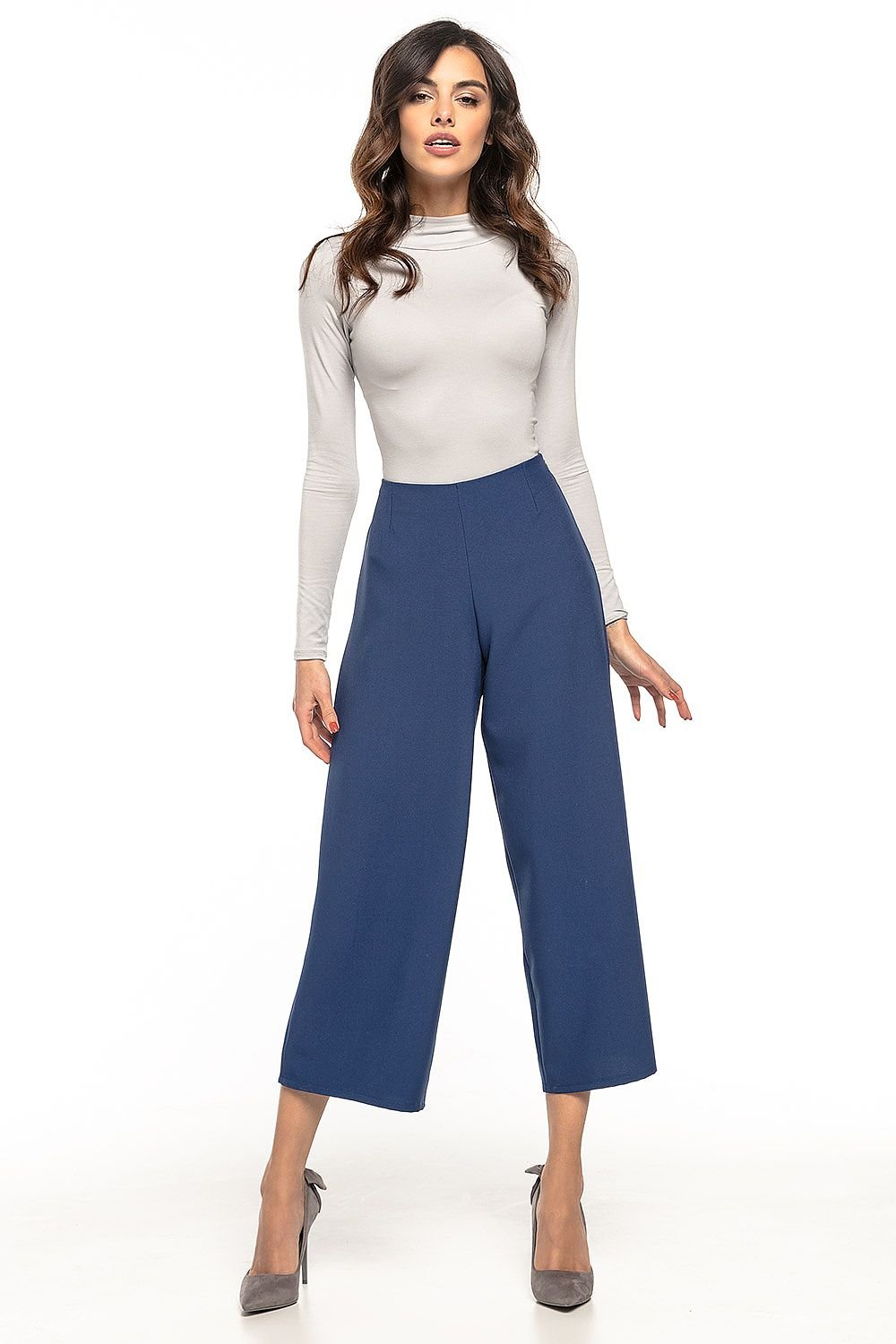 High waisted trousers with a wide leg. For a better shape we sew in darts both in the front and on the back, thanks to which the trousers fit beautifully around the waist. We sew in a decorative zipper on the side. Wide leg is our nod to the 70's, although shortening them to 7/8 length gives a more modern look. Trousers are perfect for both elegant stylizations and more casual ones.